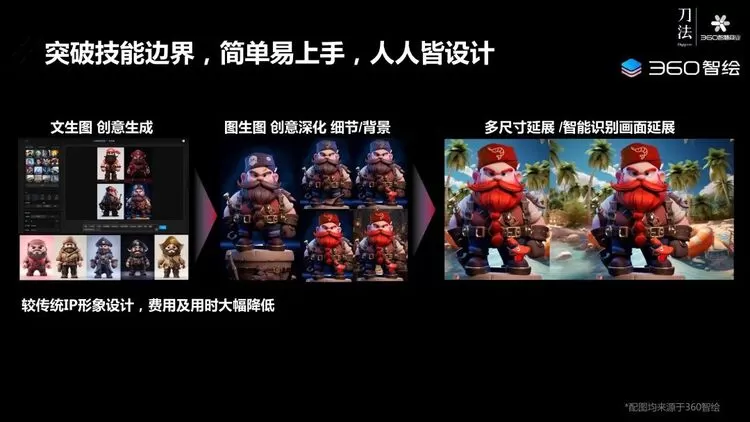 过去,我们在专业领域强调“术业有专攻”,文案和设计很难是同一个人,而在AIGC的加持下,员工可以突破技能边界,通过文生图、图生图的简单操作模式,对IP进行创作,费用及用时大幅降低,人人都能结合自己的需求进行设计,降低因沟通造成的创意流失。
