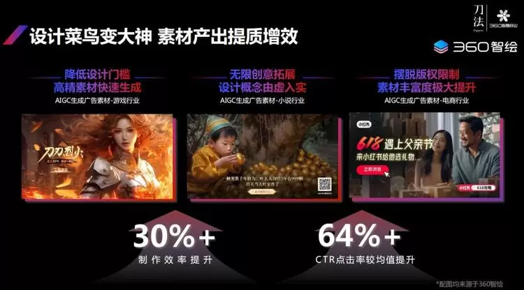 过去从一个设计菜鸟,到一个设计大神,不仅需要积年累月的基本功训练,更需要极高的天赋与悟性,而在AIGC的加持下,设计门槛被大幅降低,高精素材可以快速生成,无限创意拓展的同时也可以摆脱版权的限制,素材丰富度极大提升。以360智慧商业服务各行业客户广告素材生成为例,制作效率提升30%+,CTR点击率较均值提升64%,素材产出提质增效,每个人都可以成为设计大神。