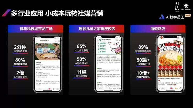 如何弥补人力不足,丰富营销手段?海盗虾饭案例给出AIGC赋能营销的新诠释。通过使用360AI数字员工、360 智绘(AI生图工具)等产品组合,辅助品牌社媒运营,低成本产出高质量传播内容的梦想已经有了实现的通路。