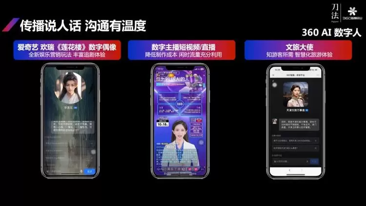 在360智脑驱动下,360AI数字人已经在多场景中展示了生成式AI数字人的多种玩法——通过学习剧本和原著,它可以复刻《莲花楼》数字偶像,升维娱乐营销玩法,丰富追剧体验;它可以是短视频/直播的数字主播,降低制作成本的同时,也让闲时流量得到了更为充分的利用;它还可以是知游客所需的文旅大使,带给游客智慧化的旅游体验……