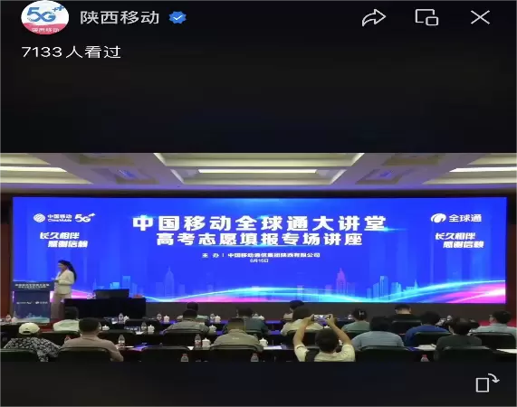 面对家庭客户群体,陕西移动利用新型传播渠道,继续开展全球通大讲堂-高考志愿填报现场直播讲座,邀请高考志愿填报专家,向有教育需求的客户在现场及视频号等自有平台进行指导讲座,直播覆盖客户50万人次,曝光量超百万,真正惠及更多客户群体。