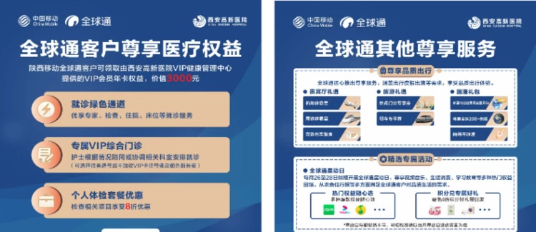 同时,陕西移动还采用跨界合作的方式,与本地三甲医院“西安高新医院”联合,利用医院医疗资源,为全球通客户提供就诊VIP通道及惠享个人体检88折等福利。随着一张移动5G网络的全面铺开,全球通在健康领域的应用将不断深入,公众也将享受到更便捷、更高品质的医疗卫生服务,真正实现“服务跨界享”!