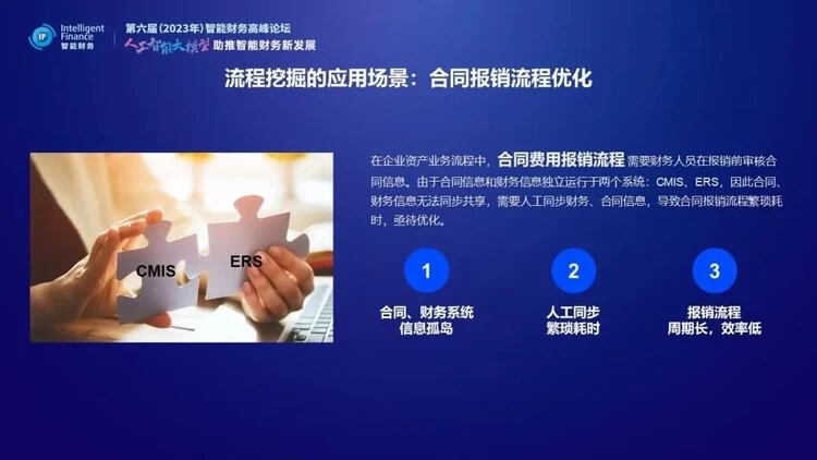 而RPM则能帮助中石化精确地定位到流程瓶颈,进行优化改善,从而提升客户满意度。吴鑫详细阐述了中石化合同费用报销流程中艺赛旗RPM在其中起到的关键作用,他指出,在中石化的资产业务流程中,财务人员在进行报销前需要审核合同信息。然而,合同信息和财务信息分别运行在CMIS和ERS两个系统中,这意味着它们不能同步共享,因此需要人工进行信息同步。这种方式使得整个合同报销流程变得繁琐和耗时,亟待优化。