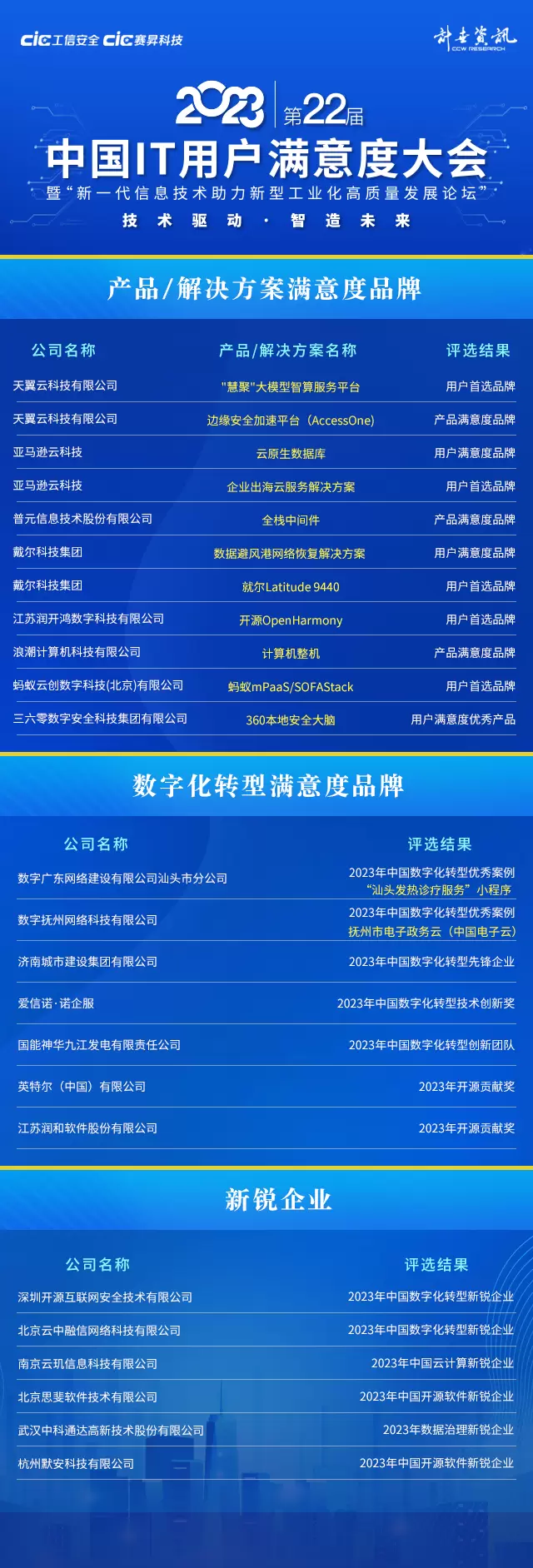 大会最后,计世资讯研究院公布了2023年中国IT用户满意度优秀产品/解决方案、优秀数字化转型满意度品牌和新锐企业的征集结果。