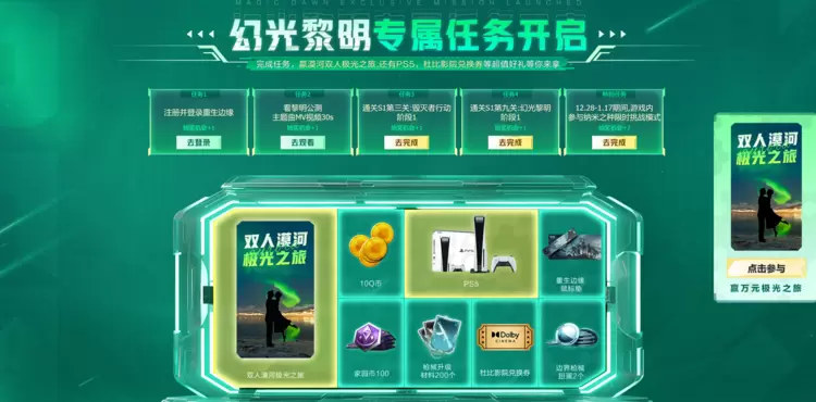 12月14日,幻光黎明专属任务开启,完成任务获得抽奖机会,就有机会赢杜比影院兑换券、PS5,甚至双人漠河极光之旅。超值好礼,尽在《重生边缘》。