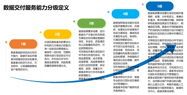数据交付服务主要指对人工智能数据集和相关服务进行交付和实施的过程。数据交付服务能力成熟度评估等级,按照评估结果共分为5级。