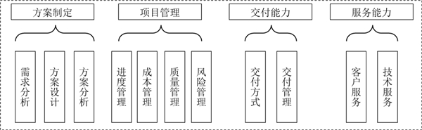 数据交付服务能力成熟度评估能力域主要包括方案制定、项目管理、交付能力、服务能力四方面。数据交付服务能力成熟度模型由成熟度评估等级和能力域构成,其中能力域由能力项构成,共计11个能力项、80余项指标。
