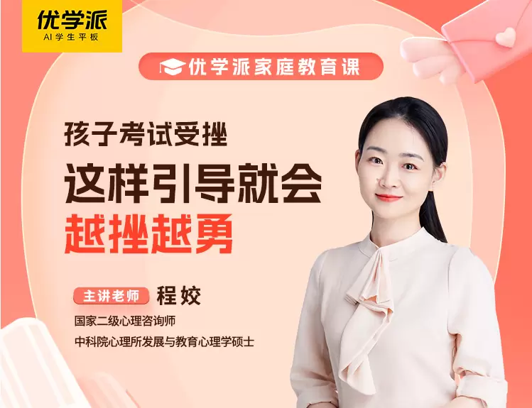在孩子的学习成长过程中,遭遇挫折是不可避免的。就拿考试举例,无论是成绩不理想,还是付出了努力进步却不显著,对孩子来说都无异于当头一棒,这时应该如何帮助他们正确认识挫折、提升抗挫折能力?又如何借助这次挫折让孩子形成成长型思维?优学派AI学生平板携手中科院心理所发展与教育心理学硕士程姣老师,带来《增强抗挫力:学习中受挫,这些技巧让孩子越挫越勇》家庭教育课程,帮助家长掌握抗挫力提升引导技巧,让孩子们在成长的过程中渐行渐稳。