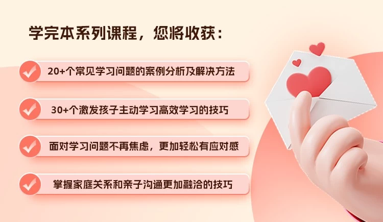 正如著名教育家叶圣陶先生说,教育的本质是培养习惯。很多家长抱怨孩子不逼、不催、不监督就不学,其实就是因为孩子没有养成主动学习的习惯。主动学习习惯一旦养成,就像点燃了一把火,孩子便能自发积极地去学习,并从中获得乐趣和成就感。好习惯的养成使孩子受益终身,优学派专门为广大家长和孩子打造了一系列家庭教育和习惯养成专题课程,帮助大家建立更加融洽和谐的亲子关系。