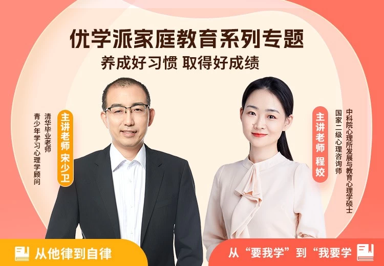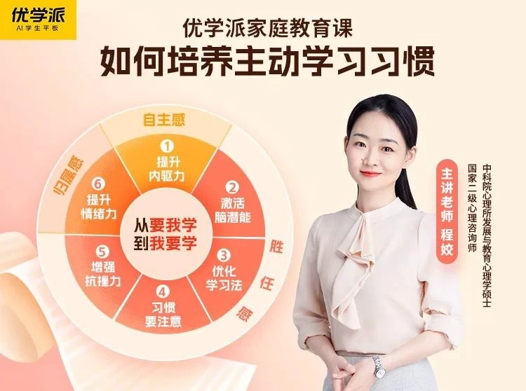 除了上述与程姣老师携手打造的“主动学习习惯培养”系列家庭教育课程外,优学派还联合在清华大学从事青少年学习科学研究多年的宋少卫老师,打造了《从他律到自律》系列课程,从身体、思维和情绪三个层面培养孩子逐渐从他律到自律,养成良好的学习习惯。如果你和孩子也正被诸如此类的问题困扰,就赶紧打开优学派AI学生平板,解锁干货满满的家庭教育知识课堂吧,不仅能让家庭亲子关系更和谐,还能帮助孩子养成良好的学习习惯,提高学习的效率与效果。