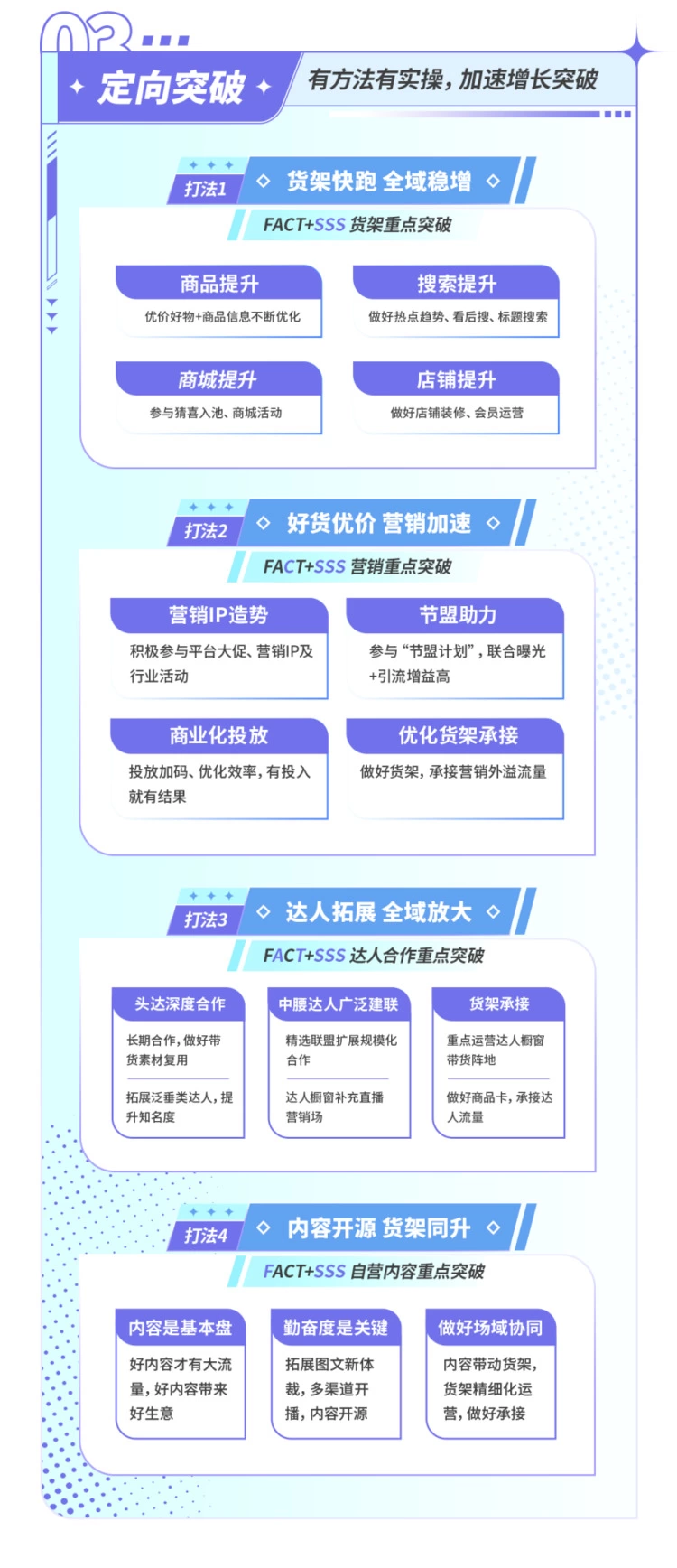 打法1广泛适用于各类需要在「货架」重点突破的商家。在全域兴趣电商,货架经营成本更具优势,品牌一旦积累了丰富且完整的货架经验,可复用平移到全品类线。做好“商品+搜索+商城+店铺”四维提升,各类品牌都可在抖音电商通过「货架快跑」,低成本撬动高收益。