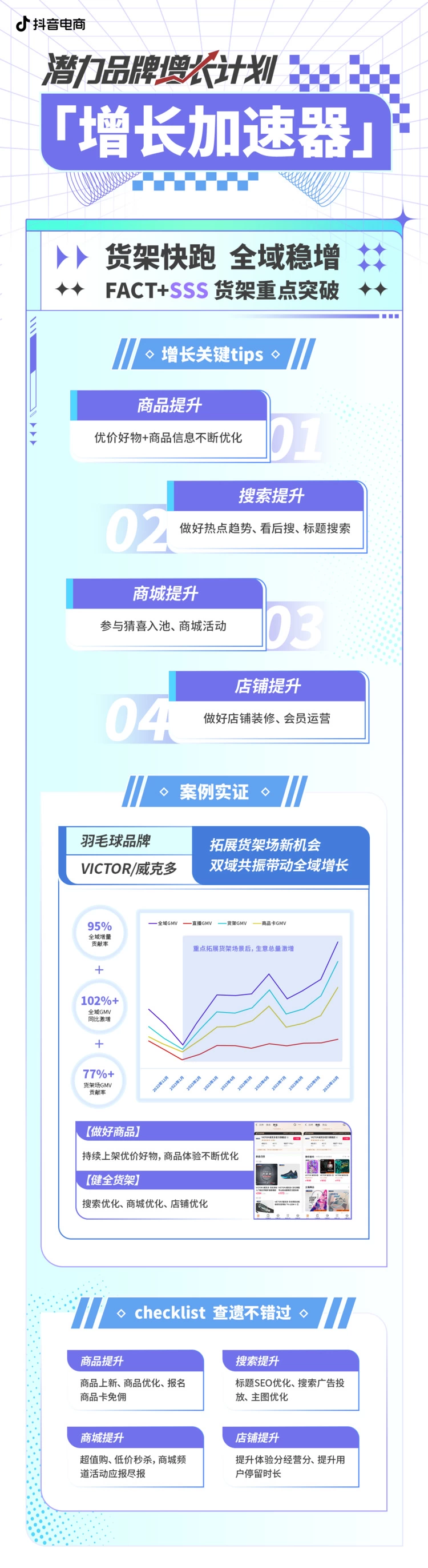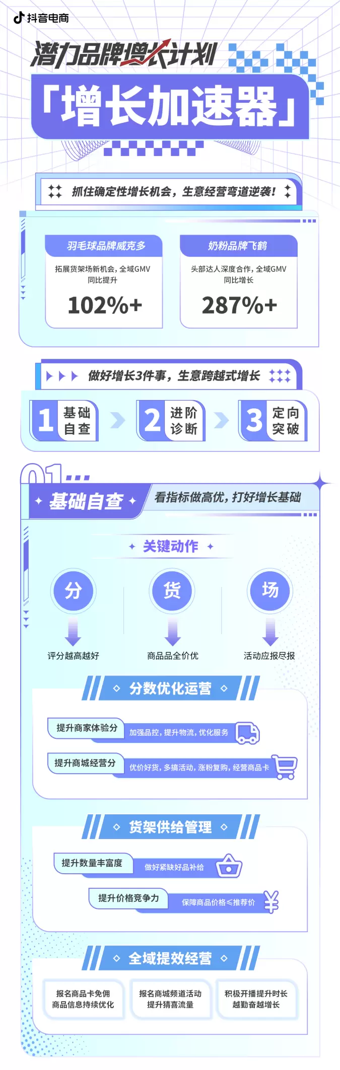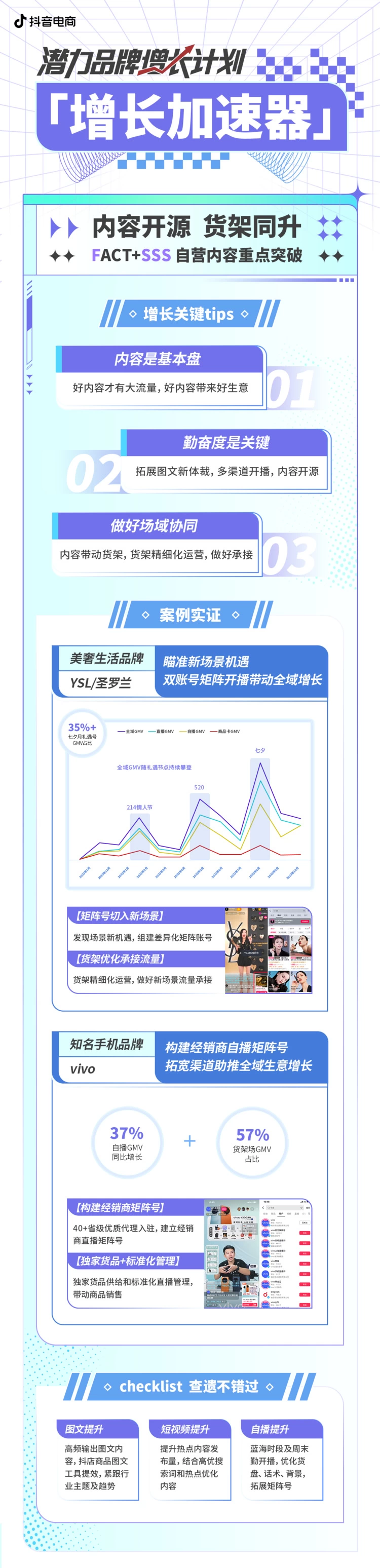 商家如何打好电商经营基本功,激活全域兴趣电商生意?如何释放增长潜力、挖掘生意新增量?为帮助品牌全面提升经营能力,找准经营方向,持续释放潜力,抖音电商推出潜力品牌增长计划,并发布「增长加速器」实操指南,以助力更多商家激活生意新增量。