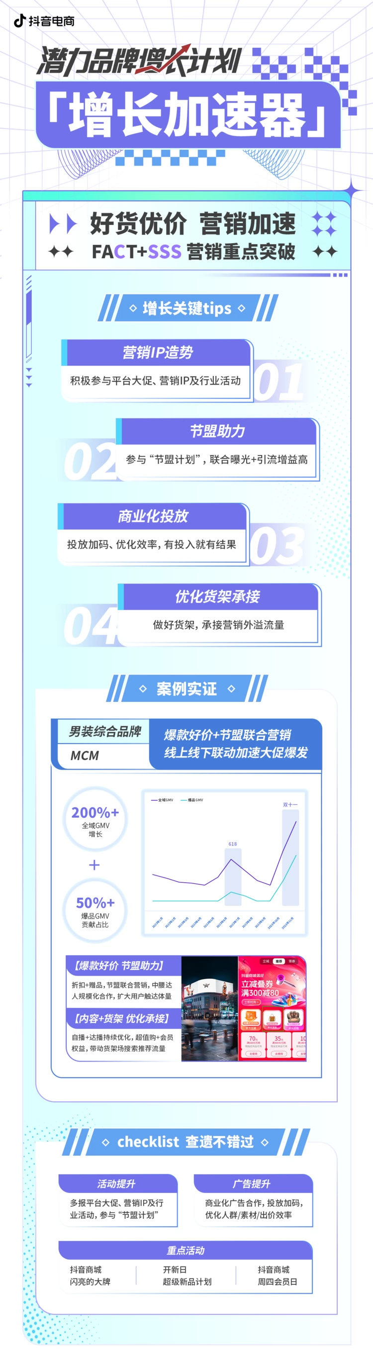 不同类型的打法适用于不同诉求的商家,无论是哪个行业、哪个体量,无论是成熟品牌还是成长型品牌,都可以在抖音电商,运用「增长加速器」挖掘自身潜力,拥抱确定性生意增长。