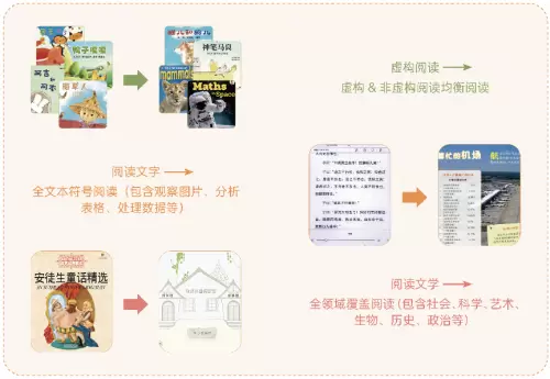 目前国内的儿童读物大多数偏虚构类阅读,非虚构阅读占比较少,因此在最初课程开发时,成长秘密就引入海量“非虚构阅读”资源进行全科阅读资源的补充,并根据不同年龄段孩子的认知发展水平将课程的“虚构阅读”和非虚构阅读”的资源进行合理配比,从“启蒙段”到“进阶段”,非虚构的主题阅读逐渐加大。主要是为了让孩子实现三个阅读上的越迁:第1个是从单一阅读过渡到均衡阅读;第2个是从阅读文字过渡到全文本符号等阅读(包含观察图片、分析表格、处理数据);第3个是从阅读文学过渡到全领域阅读(包含社会、科学、人文、艺术、历史等)。