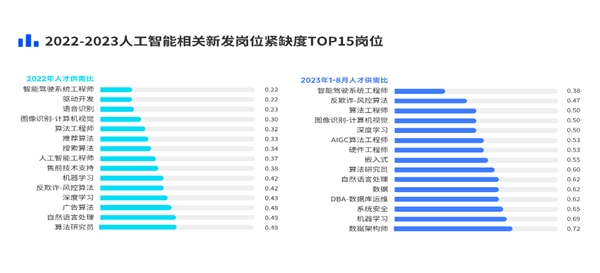据脉脉高聘调查的数据显示,2023年1-8月,在人工智能新发岗位紧缺度TOP15中,智能驾驶系统工程师凭借0.38的人才供需比位列第一,几乎是5个岗位争夺2个人才。值得注意的是,这已经是智能驾驶系统工程师连续第二年,成为人工智能相关岗位中最紧缺的一个。