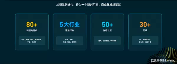 镜舟科技在过去一年里取得了显著的商业化进展,签约客户数达到 80 多家,业务覆盖金融、零售、物流、制造和互联网5 大行业,与硬件、操作系统、中间件等50+上下游产业伙伴完成生态认证,同时也收获来自 IDC、爱分析、金融信息化等各个咨询机构、媒体颁发的 30+ 奖项。