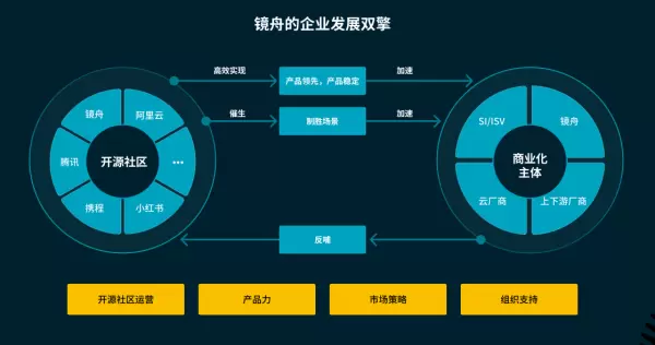 镜舟科技的企业发展受到两个主要引擎的推动:开源社区和商业化主体。我们把开源社区看成是汽车的发动机,商业化主体看作汽车的燃料。通过开源社区和商业化相结合,来完善产品能力和企业服务能力,推动企业的快速发展和转型。
