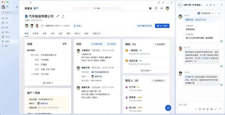 各行各业依赖专业业务管理系统作业的用户,也能通过飞书更高效的实现工作协同。现在,无需开发,用户即可在飞书内直接打开 CRM、ERP、MES、PLM 等专业业务系统,并能在业务系统中一键拉群、共创文档等,围绕客户、工单等业务信息及时展开讨论,高效协作。