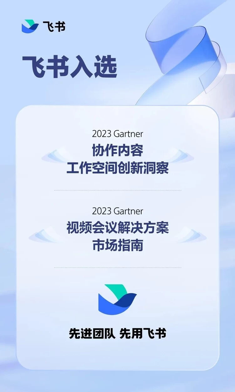 近日,国际 IT 研究与顾问咨询机构 Gartner 发布的 2023 年《协作内容工作空间创新洞察》(Innovation Insight:Collaborative Content Workspaces)和《视频会议解决方案市场指南》(Market Guide for Meeting Solutions)两份报告中,飞书都入选了!