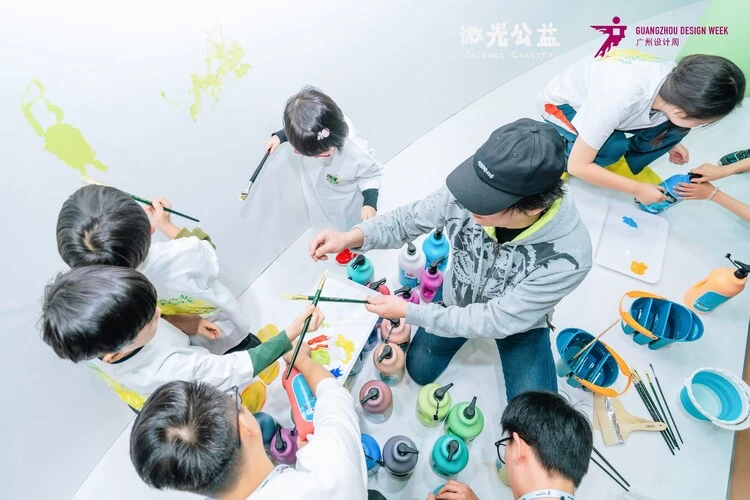 活动现场,陈林老师作为微光公益计划的首倡者,与孩童们现场共同完成了墙体及地面的绘画创作:《孩童眼里的春天》。来自不同地域不同年龄的设计师们现场挥笔为画作和微光公益计划助力。提笔描绘,落笔成诗,温暖爱意在一笔一画间向远方传递,善意在色彩翻涌中回归至最真诚的表达。