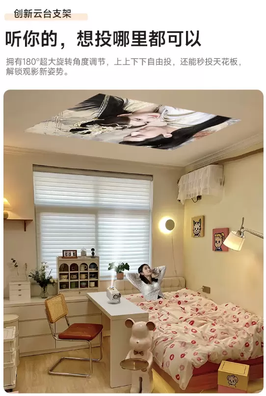 大眼橙C1 Air投影外国比较小巧,重仅1.25KG,一手可拿,轻便不占地,外出使用随带随走。前脸标志性的“大眼”镜头设计,云雾金的配色清新素雅,好看又百搭,摆放在家里轻松融入家居风格。创新性采用了云台支架设计,支持180°超大旋转角度调节,大屏观影更自由,还能秒投天花板,不仅可以坐着看还能躺着看。