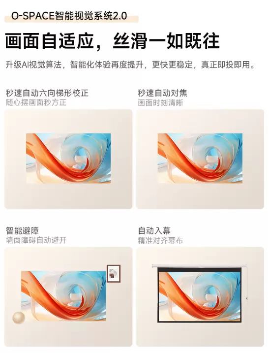 智能化体验上,大眼橙C1 Air投影仪拥有行业高配画面自适应功能,支持自动对焦、自动梯形校正、智能避障、自动入幕等操作,通过AI视觉算法,开机就能完成画面的对焦、校正,更快速、更精准、更丝滑,完全无需手动反复调整,操作上更为简便,新手小白也能轻松上手。