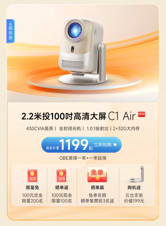 12月14日,大眼橙首款云台投影新品C1 Air正式发布并开启预售,首发到手价1199元,预购享2年质保,送专属云台支架,付尾款限量200名返100元京东E卡,还有免单、腾讯视频会员等一众晒单好礼相送。作为智能投影仪头部品牌的大眼橙,此次推出的千元投影仪大眼橙C1 Air到底性能如何?让我们一起来看看参数简单了解一下~
