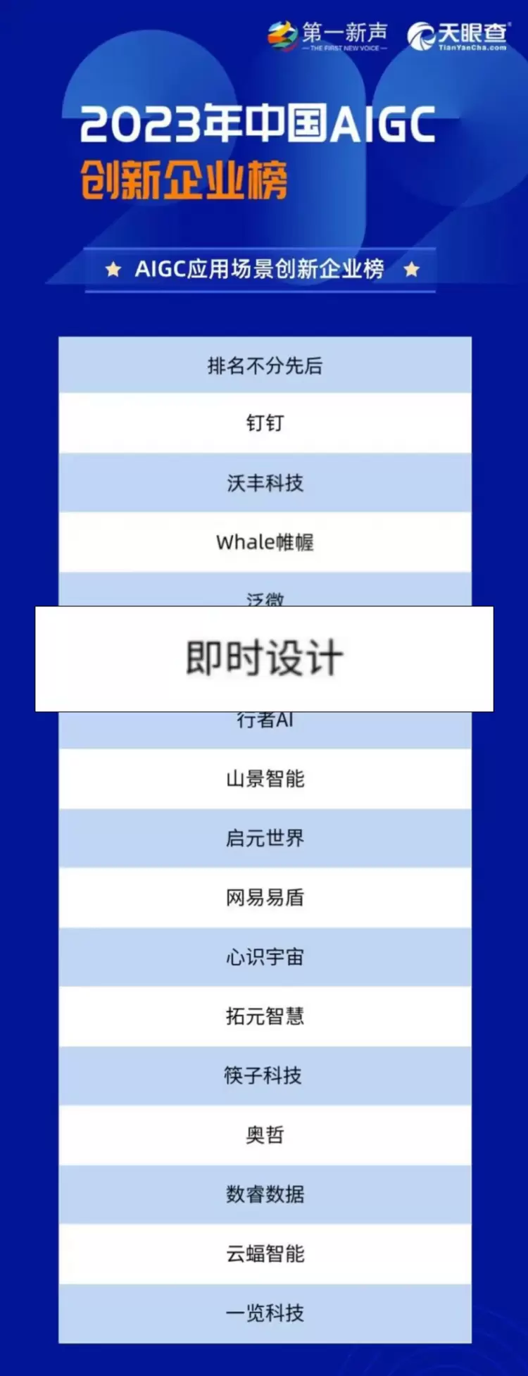 近日,「第一新声」联合「天眼查」发布了“2023年度中国AIGC创新企业榜”,在众多参选企业中,即时设计凭借在 AIGC垂直领域的应用创新与成功实践脱颖而出,入选“AIGC应用场景创新企业榜”。
