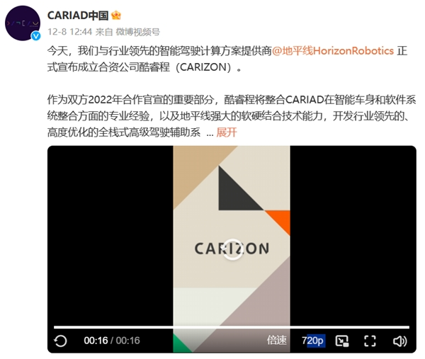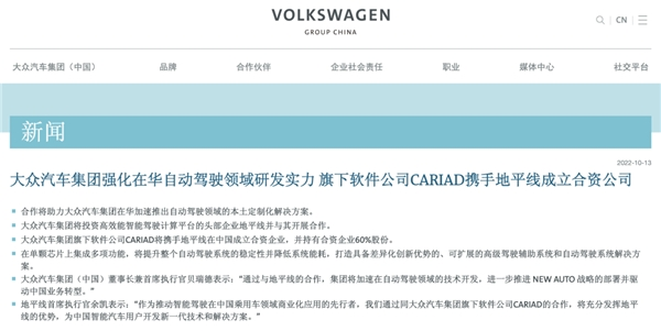 本月8号,CARIAD官微发布消息,大众汽车旗下软件公司CARIAD与地平线的合资公司酷睿程CARIZON正式成立。