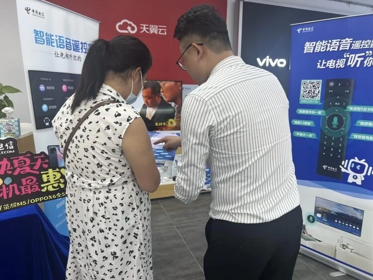 “现在年轻人喜欢给父母买智能大电视,又没时间教。老人以前喜欢看的直播、新闻频道不知道从哪找,再加上遥控器多,按键密密麻麻,操作繁琐,对老年人很不友好。老人遇到问题找不到人帮忙,就不爱看电视了,逐渐与社会脱节。”在活动现场,电信营业厅工作人员专门设置了产品介绍和体验区,详细为到场客户介绍特色适老化产品和服务,为老年人们耐心讲解语音遥控器的使用方法,并演示了如何通过语音控制电视来快速选择自己喜欢的节目,守护老年人的“看电视自由”。