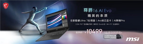 作为首批搭载英特尔新一代酷睿Ultra处理器的笔记本,微星新品尊爵16 AI Evo、尊爵13 AI Evo均支持英特尔Evo平台。其中,定位于超轻商务本的尊爵16 AI Evo将于12月15日15点上线预售,18日0点开始抢购。凡是参与晒单活动的用户,即有机会获得背包、鼠标等礼品。