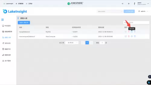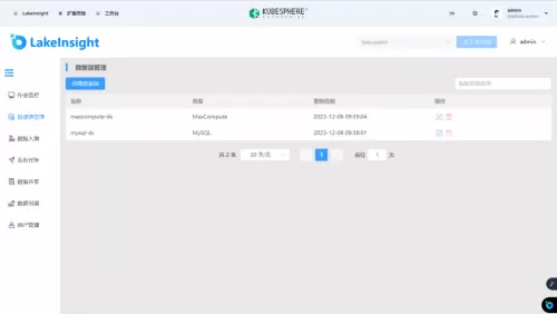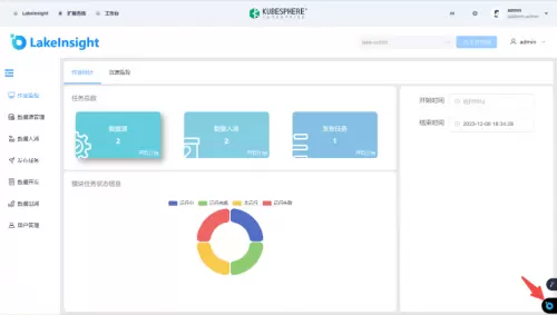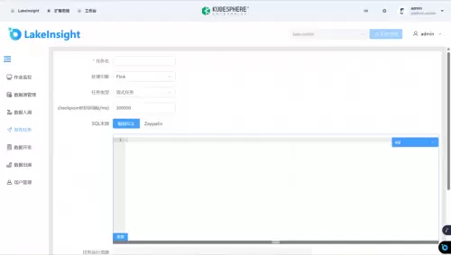 LakeInsight 用户可在 KubeSphere 导航栏直接进入数元灵数据智能平台,来进行数据源添加,数据入湖,数据分析,任务管理等操作。