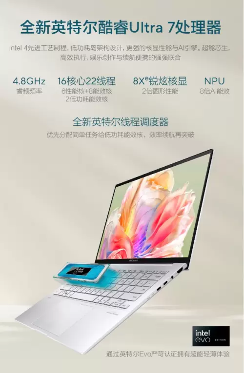 华硕灵耀14 2024首发搭载英特尔酷睿Ultra7处理器,与Intel携手开启AI PC新纪元。酷睿Ultra处理器采用Intel4制造工艺,在技术创新上有所突破,引入EUV光刻、高密度MIM电容器等创新性技术,相对上一代工艺,Intel4实现了两倍的面积微缩,让处理器拥有更高的晶体密度,因此,酷睿Ultra在处理复杂计算任务时,如AI应用运行、大数据处理、视频剪辑、科学计算等,能提供更快的运行速度和更低的功耗。