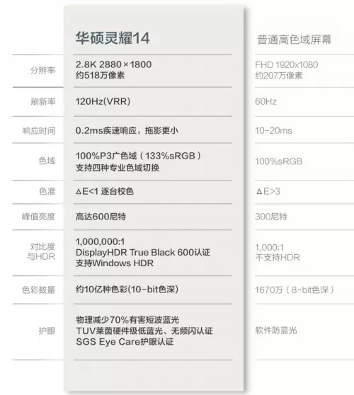 屏幕方面,灵耀14 2024升级采用2.8K 120Hz Lumina OLED屏幕,拥有100% P3影院级广色域、10亿色彩、平均ΔE<1高色准、600尼特峰值亮度、100万:1真HDR对比度,经过出厂精准校色,支持四种专业色域切换,画面真实色彩准确,无论是日常办公还是创作设计都能满足;支持VRR可变刷新率,消除画面的卡顿或撕裂现象,提升流畅度,为用户提供极致出色的视觉观感和流畅的使用体验感;搭载智能环境光感应器,随着环境光照变换,屏幕可自动调节亮度与色温;通过TÜV莱茵硬件级低蓝光无频闪认证、SGS Eye Care护眼认证,支持DC调光,呵护双眼。除此之外,华硕还提供“华硕好屏,无忧换新”服务,真正做到让用户用屏无忧。