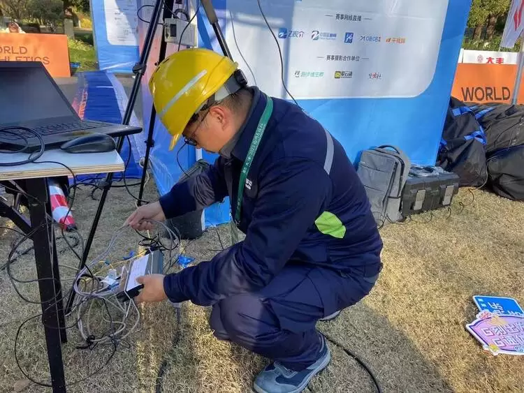 (浙江移动工作人员在杭州马拉松现场进行网络保障)