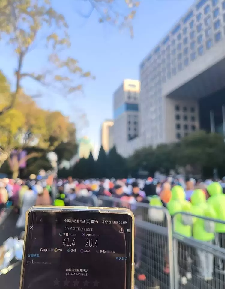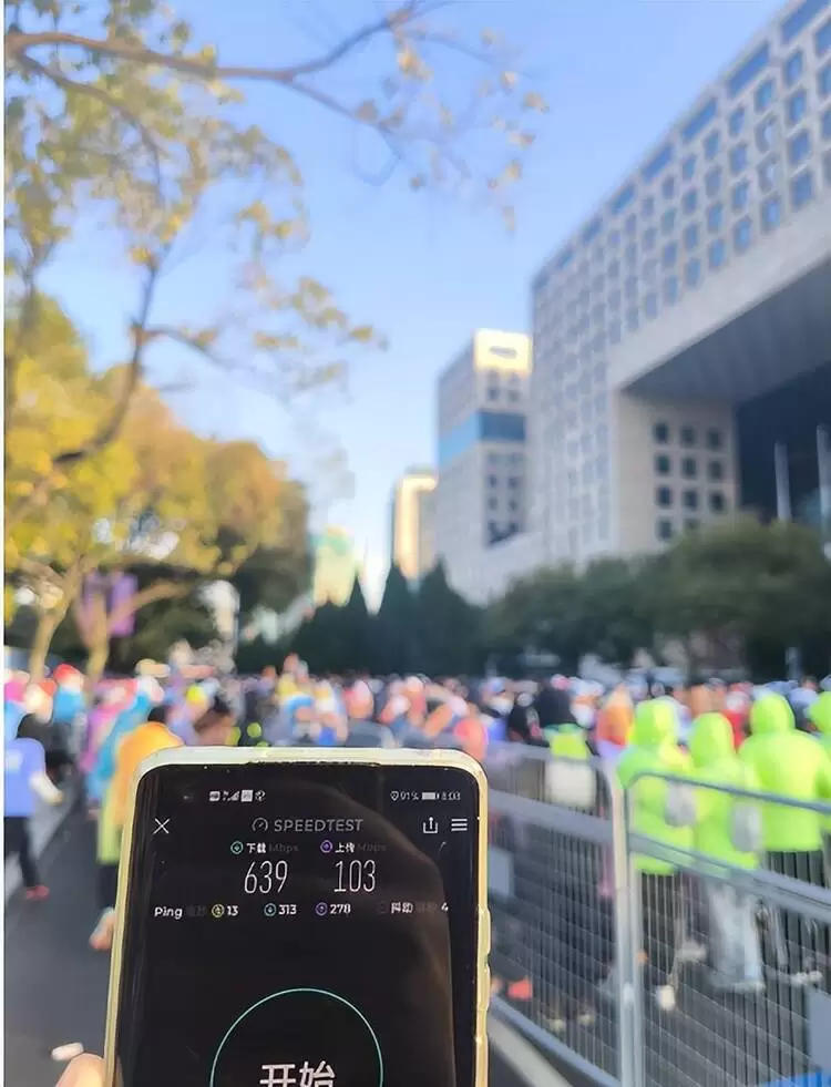 (杭州马拉松赛道周边,浙江移动工作人员测量网速)