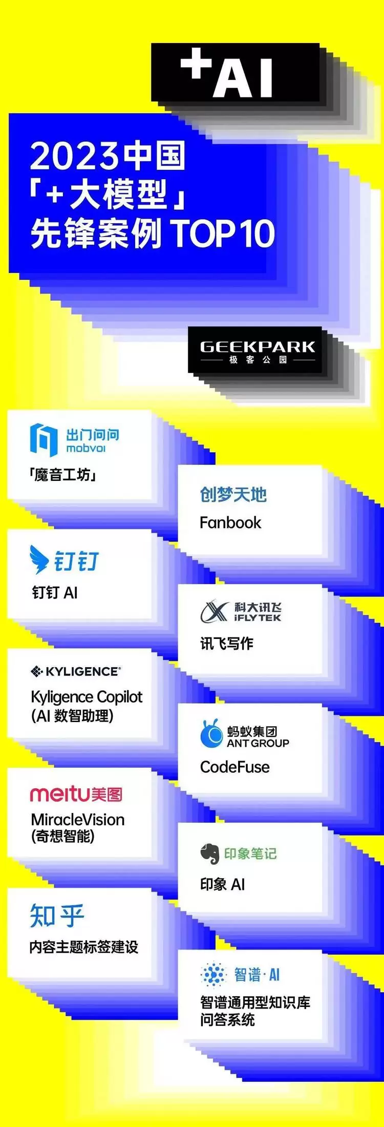 2023中国+大模型先锋案例由极客公园评选,从产品力、商业模式创新、商业价值创造三个维度评选中国大模型的先锋。