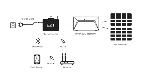 River1600可直接与光伏组件相连,将组件发出的电力存储在电池中,在需要时微型逆变器EZ1可将电池中的直流电转换为交流电供家庭负载使用,这样的设计进一步提高了系统的转换效率,让光伏电能最大限度的被家庭所利用;整个过程,用户可以根据实际情况,通过蓝牙或Wi-Fi方式将系统与AP EasyPower App相连,了解光伏系统发电、储能电池充放电情况,并实现电能控制及多级转换等功能;整套微光储系统的安装、并网非常简单,只需要简单的即插即用,就能实现各个关键设备的连接,同时只需将微逆EZ1的交流插头与家中的插座相连,就能轻松并网发电,对于用户DIY安装极其友好。