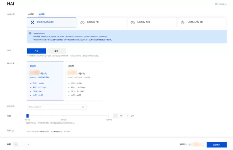 HAI提供多种预装模型环境,包括StableDiffusion、ChatGLM等热门模型,用户也可以根据自身需要最新的开源模型下载部署到HAI之,实现更个性化的创作;同时,HAI通过“可视化界面”,为开发者提供友好的图形化交互视图,支持JupyterLab、WebUI等多种算力连接方式。这样一来,在几分钟之内就能自动构建LLM、AI作画等应用环境。