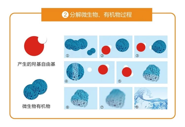 AOP形成的羟基自由基(-OH)能够分解、降解水中大多数微生物和有机物,生成CO₂、O₂、N₂和H₂O等无机物,较强的降解能力,确保泳池水质持续优化。