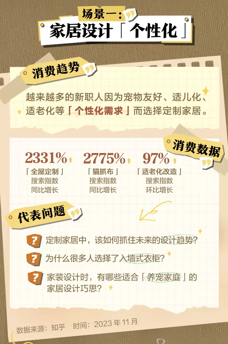因为宠物友好、适儿化、适老化等“个性化需求”而选择定制家居,正在成为新职人家居设计的消费趋势。知乎上“全屋定制”的搜索指数同比增长2331%,“猫抓布”搜索指数同比增长2775%,“适老化改造”搜索指数环比增长97%。