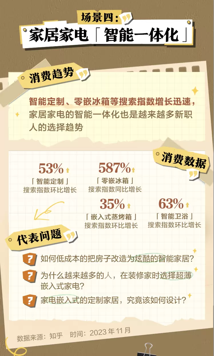 随着智能定制、零嵌冰箱等搜索指数增长迅速,家居家电的智能一体化也是越来越多新职人的选择趋势。《新职人“量身定制”的家居美学图鉴》显示,知乎上“零嵌冰箱”搜索指数同比增长高达587%,“智能定制”“智能卫浴”增长分别为53%、63%。