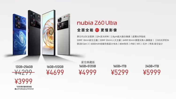 即日起,努比亚Z60 Ultra将在中兴商城、京东开启预售,并于12月26日正式开售。京东之家线下门店也将逐步露出。努比亚Z60 Ultra 12GB+256GB版售价4299元,即日起至12月26日9:59:59京东下单直减300元,仅需3999元;16GB+ 512GB版4699元,16GB+1TB版5299元,24GB+1TB版5999元。努比亚Z60 Ultra星空典藏版16GB+ 512GB售价4999元。