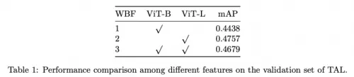 在实验过程中,TeleAI团队发现级联特征的mAP略低于ViT-L,但仍优于ViT-B。尽管如此,基于各种方法在验证集上的表现,将不同特征在评测集的预测结果借助WBF进行融合,最终提交到系统的mAP为0.50。