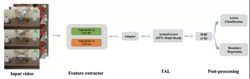 因此,该团队通过解析JSON标注文件,将TAL数据集转换为动作识别数据集。然后以Vit-B和Vit-L为主干网络,在VideoMAE-v2网络后增加adapter层及用于分类的linear层,训练同数据域下的动作分类器,并将动作分类模型去掉linear层,用于视频特征的提取。VitB模型的特征维度为768,而ViTL模型的特征维度为1024。同时concat这两种特征时,新生成一个维度为1792的特征,该特征作为训练时序动作定位模型的备选。训练初期,团队也使用了音频特征,但实验结果发现mAP指标有所下降。因此,在随后的实验中没有考虑音频特征。