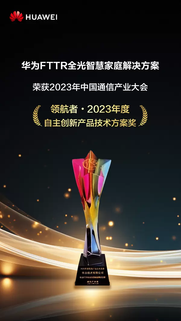 在2023中国通信产业大会暨第十八届中国通信技术年会期间,华为FTTR全光房间解决方案荣获2023年度通信产业金紫竹“领航者•2023年度自主创新产品技术方案”大奖。