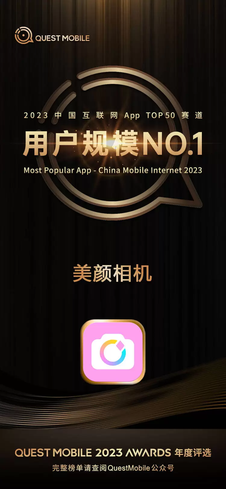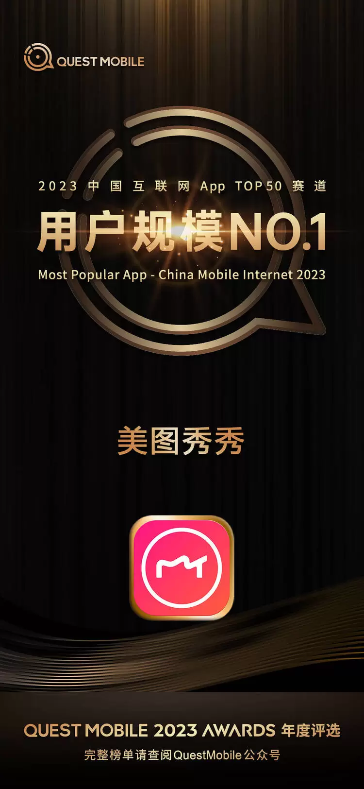12月19日,QuestMobile发布《2023中国互联网核心趋势年度报告》,美图公司旗下产品取得双冠军:美图秀秀连续8年获得中国图片美化赛道用户规模第一名,美颜相机连续8年获得中国拍照摄影赛道用户规模第一名。