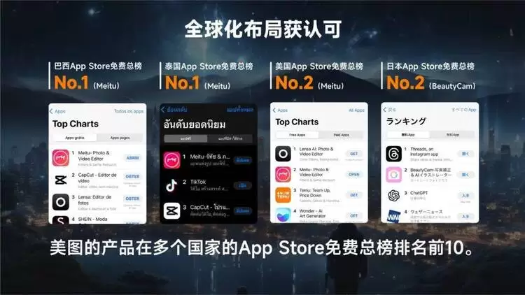 此外,美图秀秀、美颜相机还凭借丰富的AI玩法风靡海外,全球化成绩亮眼,2023年,美图秀秀、美颜相机的海外版,多次斩获日本Google Play、IOS应用市场的榜单冠军,并多次领跑韩国、泰国的GooglePlay的排行榜。