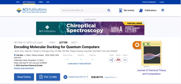2023年12月13日,北京玻色量子科技有限公司(以下简称“玻色量子”)联合上海交通大学在中科院分区1区、计算化学领域Top刊物JCTC(Journal of Chemical Theory and Computation)内刊的封面上发表了以“Encoding Molecular Docking for Quantum Computers”(基于量子计算机实现的分子对接程序)为题的学术论文。
