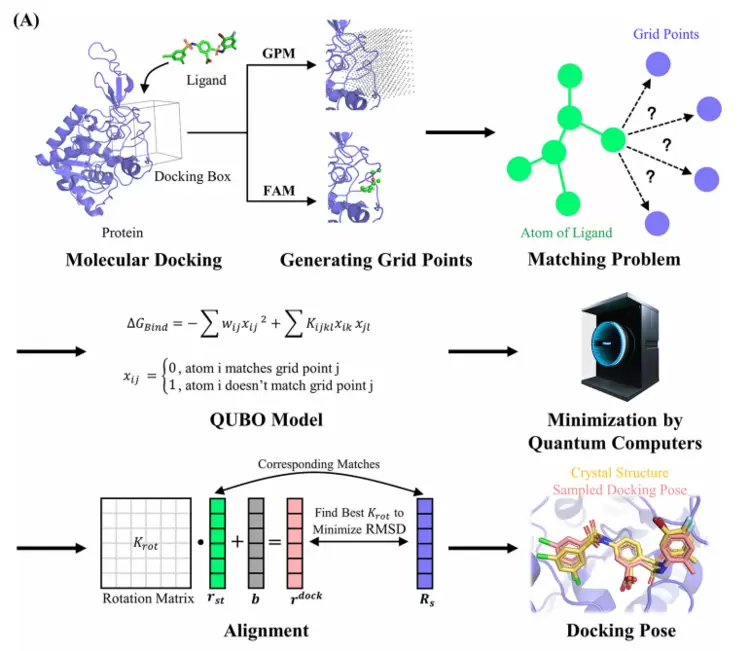 分子对接被广泛应用于虚拟筛选、先导化合物优化以及分子机制研究中,它通过空间采样来确定配体分子与受体蛋白间的结合姿态以及集合自由能(ΔGbind)。分子对接是药物发现的重要技术手段,分子对接过程的采样步骤是一个经典的NP-Hard 问题,其巨大的搜索空间和计算要求对于传统计算机充满了挑战。